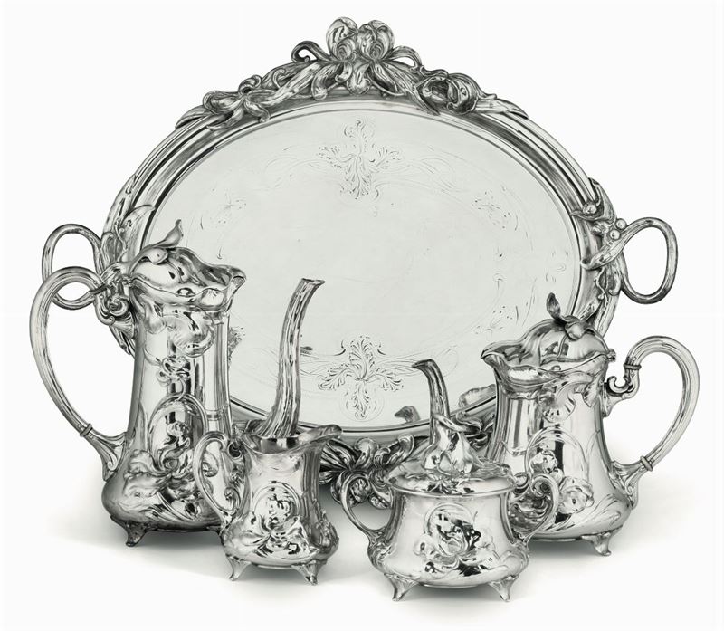 Servizio da tè e caffè in metallo argentato.