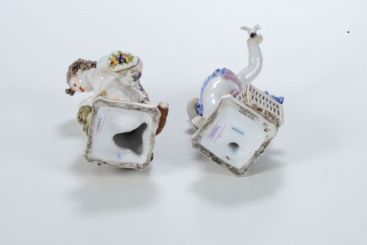 Porcellana. Marca: scettro in blu; numeri e lettere impressi. Alt. cm 20 circa. Un putto con sbeccature a tre dita della mano destra; l’altro con sbeccatura alla cornucopia