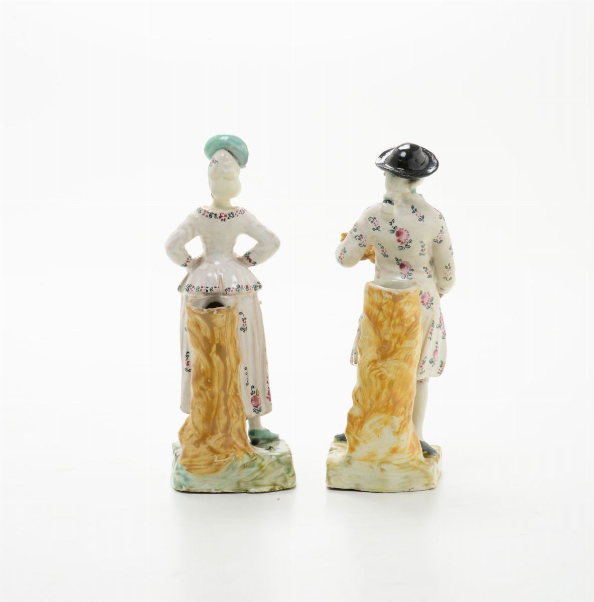 Maiolica. Marca: assente. Altezza cm 20 circa. Il personaggio femminile ha la testa rincollata; cappelli con restauri; una mano del personaggio maschile restaurata
