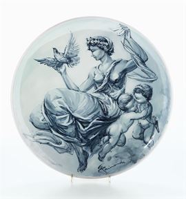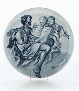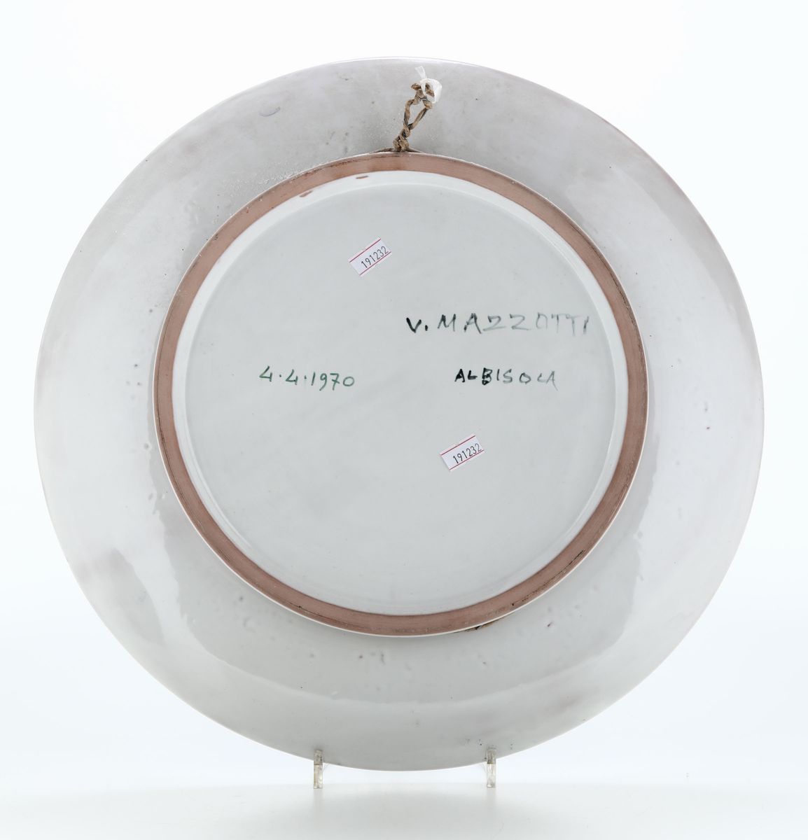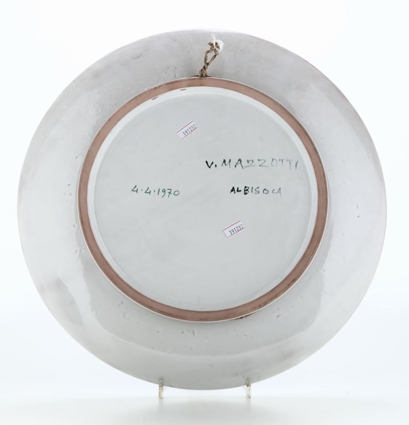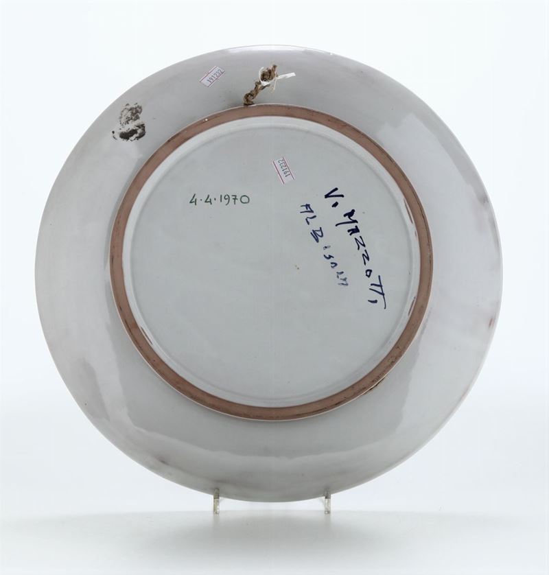 Maiolica monocroma blu. Marca: sul verso “V. Mazzotti Albisola” in blu, data “4.4.1970” in verde; firma del pittore G.Raimondi, in blu sul recto. Diametro cm 39. Stato …