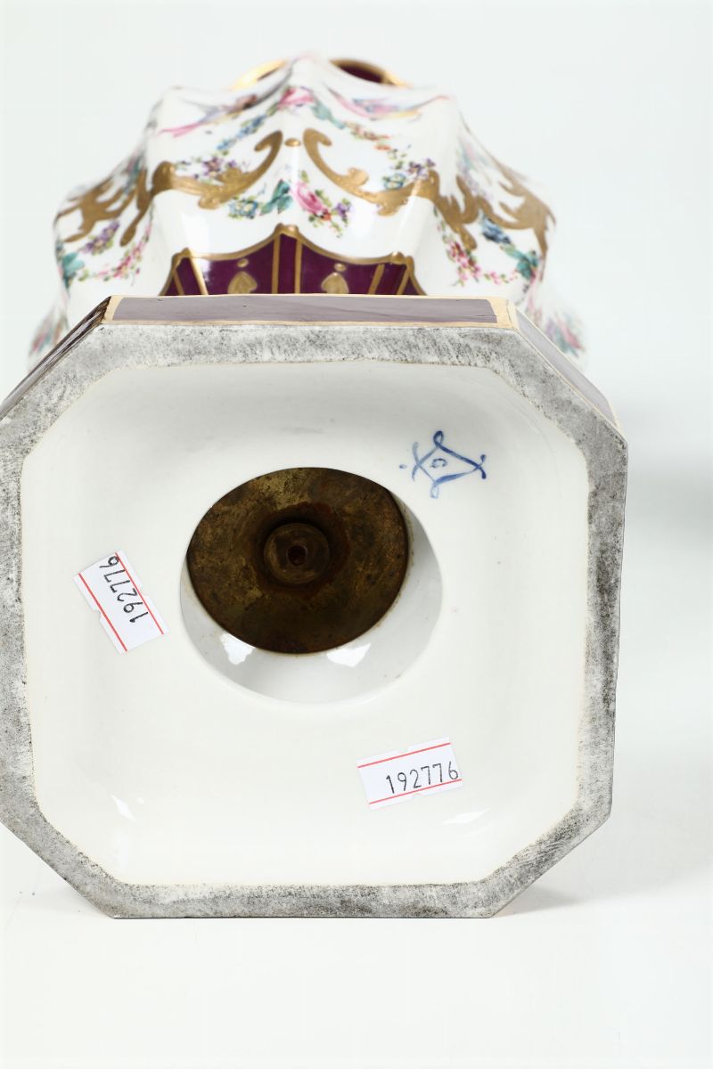 Porcellana. Marca: pseudo marca di Sèvres con due “L” intrecciate con lettere “G” e rispettivamente “D”, in blu. Altezza cm 46. Insignificanti usure all’oro