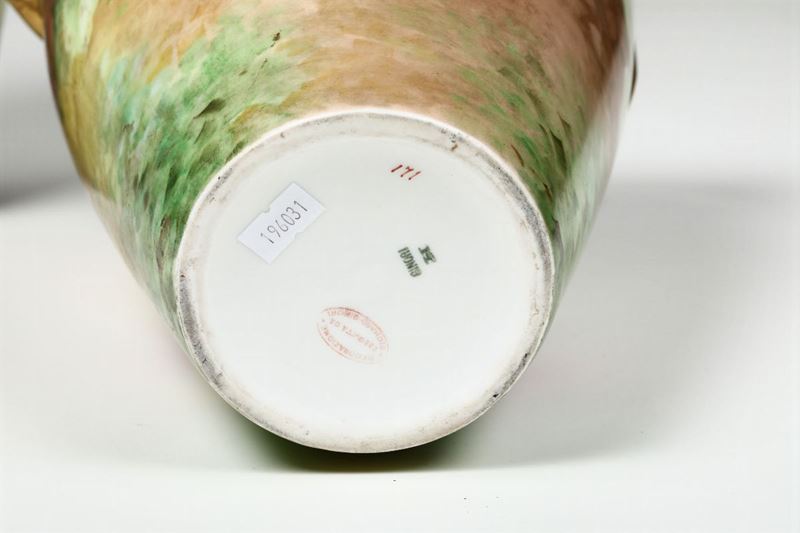 Porcellana. Marca: “Ginori” in verde; “Decorazione eseguita da Richard Ginori” e numero “171” in rosso; firma del pittore nella decorazione. Altezza cm 32. Leggere usure all’oro