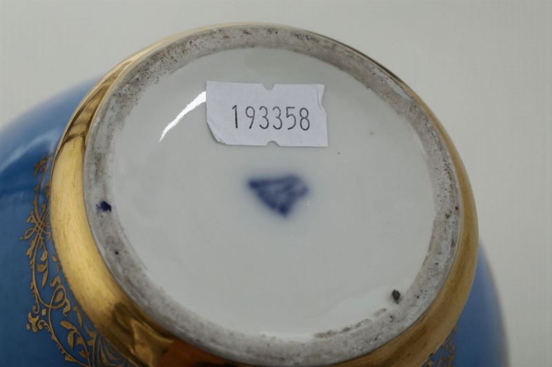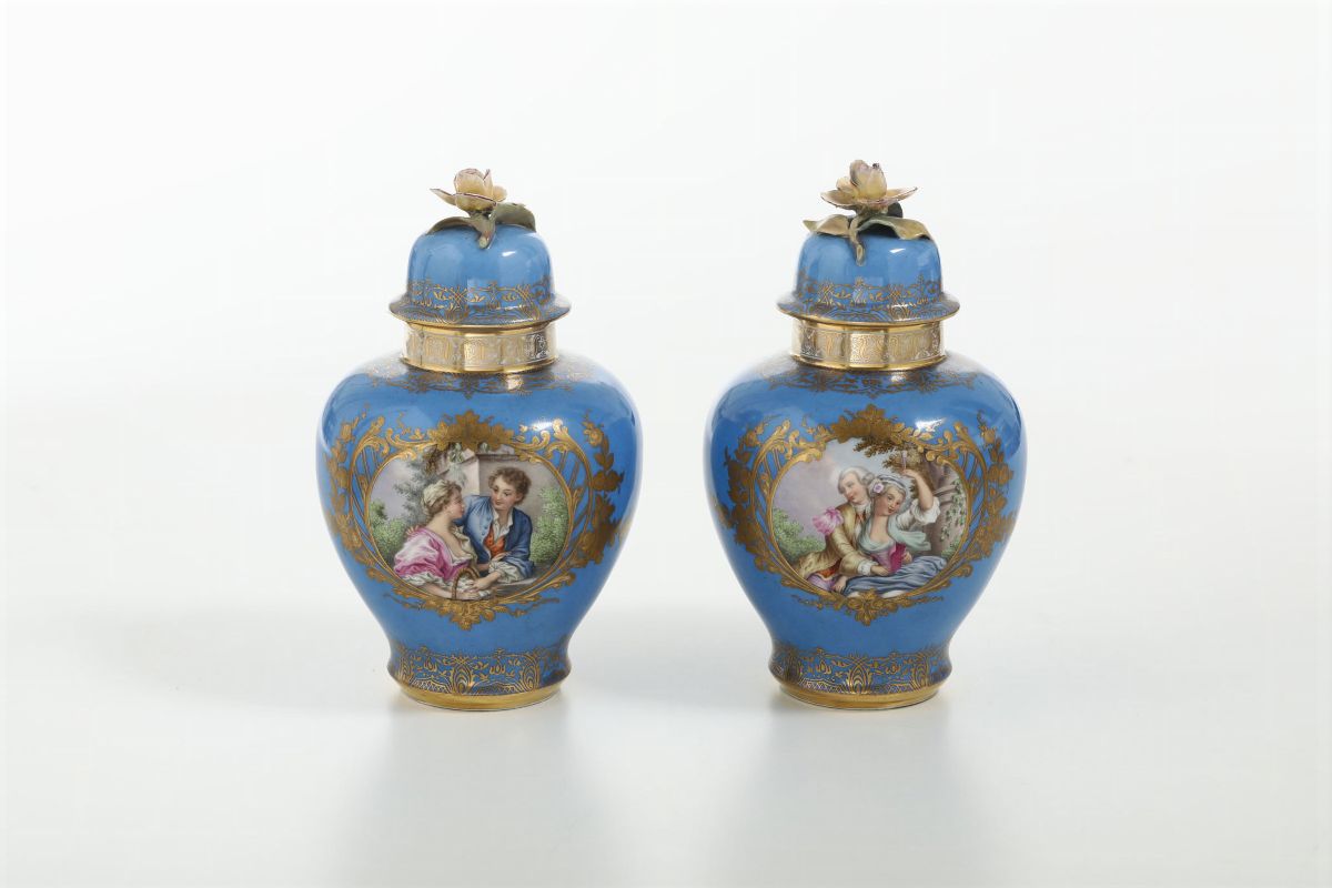 I due vasi a potiche dal fondo celeste sono decorati ciascuno con due riserve, incorniciate da rocailles in oro, con scene galanti di giovani a mezzo busto ispirati dalla pittura settecentesca francese. Anche sui coperchi, dalla presa a grande fiore fogliato, una riserva incornicia rispettivamente un giovane e una giovinetta.