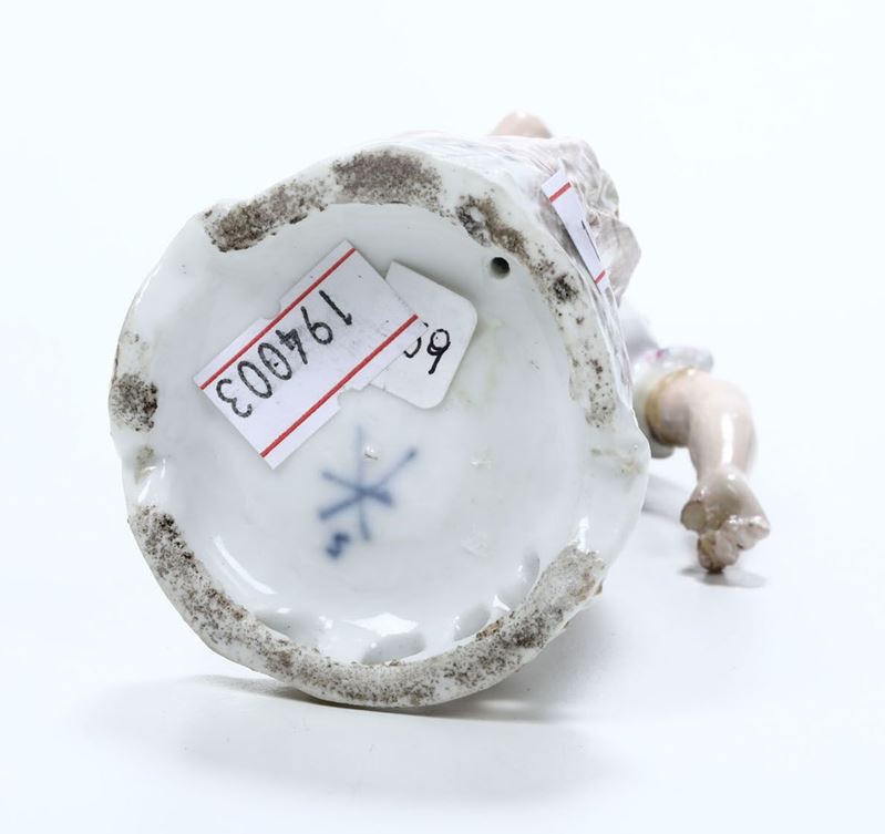 Porcellana. Marca: tre barre che si incrociano e lettera “S” in blu. Altezza cm 14,5. Braccio destro ricomposto restauro