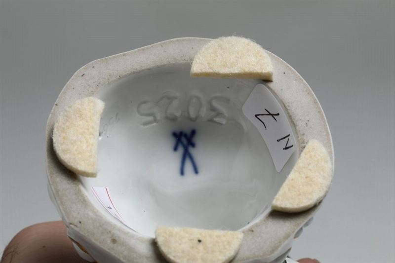 Porcellana policroma. Marca: spade in blu; numeri “3025” incisi e “756” impressi. Altezza cm 25,5. Punta della piuma del cappello rincollata; batocio restaurato
