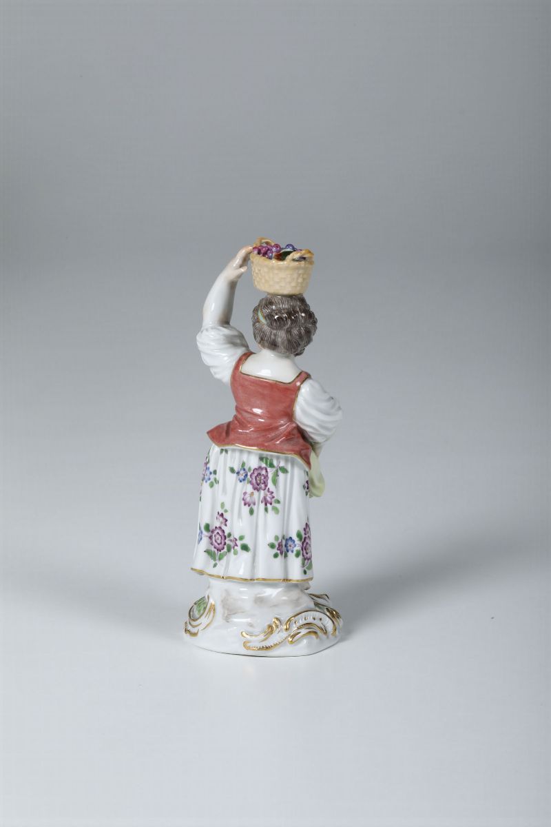 Su zoccolo a rocaille poggia una bimba vendemmiatrice, scalza, che tiene con una mano un cesto in testa e con l'altra il grembiule ricolmi di grappoli d’uva