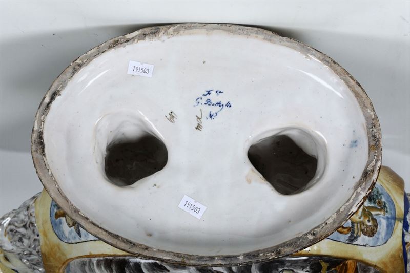 Maiolica policroma. Marca: “Fca G. Battaglia N.” in blu; “691” e “ma” in grigio. Altezza cm 52; 60 x 23. Il piede è attaccato alla coppa a freddo