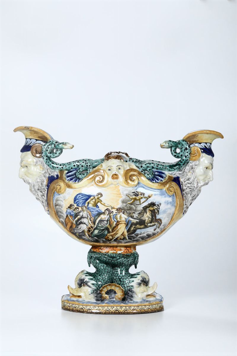 Sul piede, formato da due grandi delfini, poggia la coppa dipinta con scene mitologiche istoriate racchiuse in una cornice rocaille sormontata al centro da un mascherone. Ai lati, che fungono da manici, due grandi mascheroni barbuti con diadema uniti tra di loro da serpenti