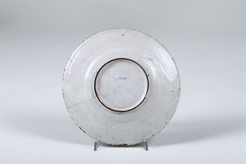 Maiolica a gran fuoco. Marca: assente. Diametro cm 24,5. Felature e minime sbeccature