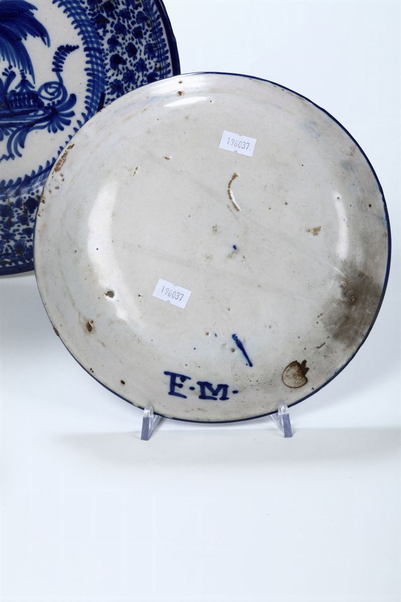 Maiolica. Marca: “F.M.” in blu sotto un piatto. Diametri cm 29; 25; 23; 22,5