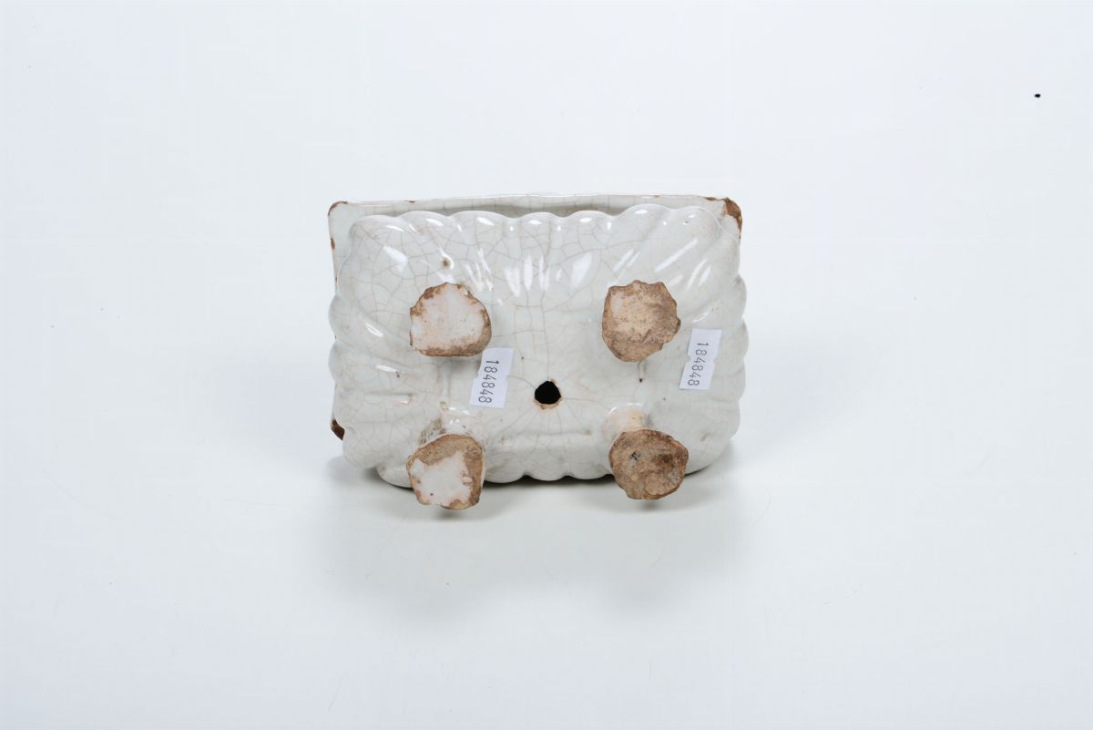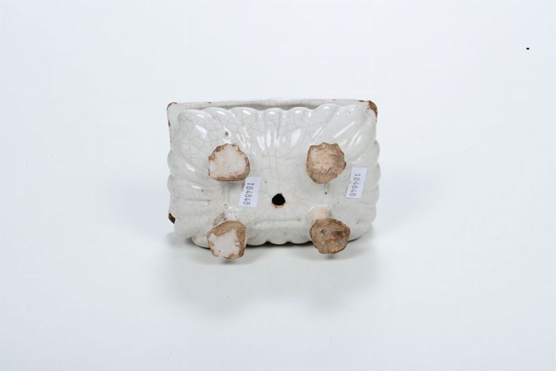 Maiolica bianca. Altezza cm 8,3; 14,4 x 9,4. Minime sbeccature