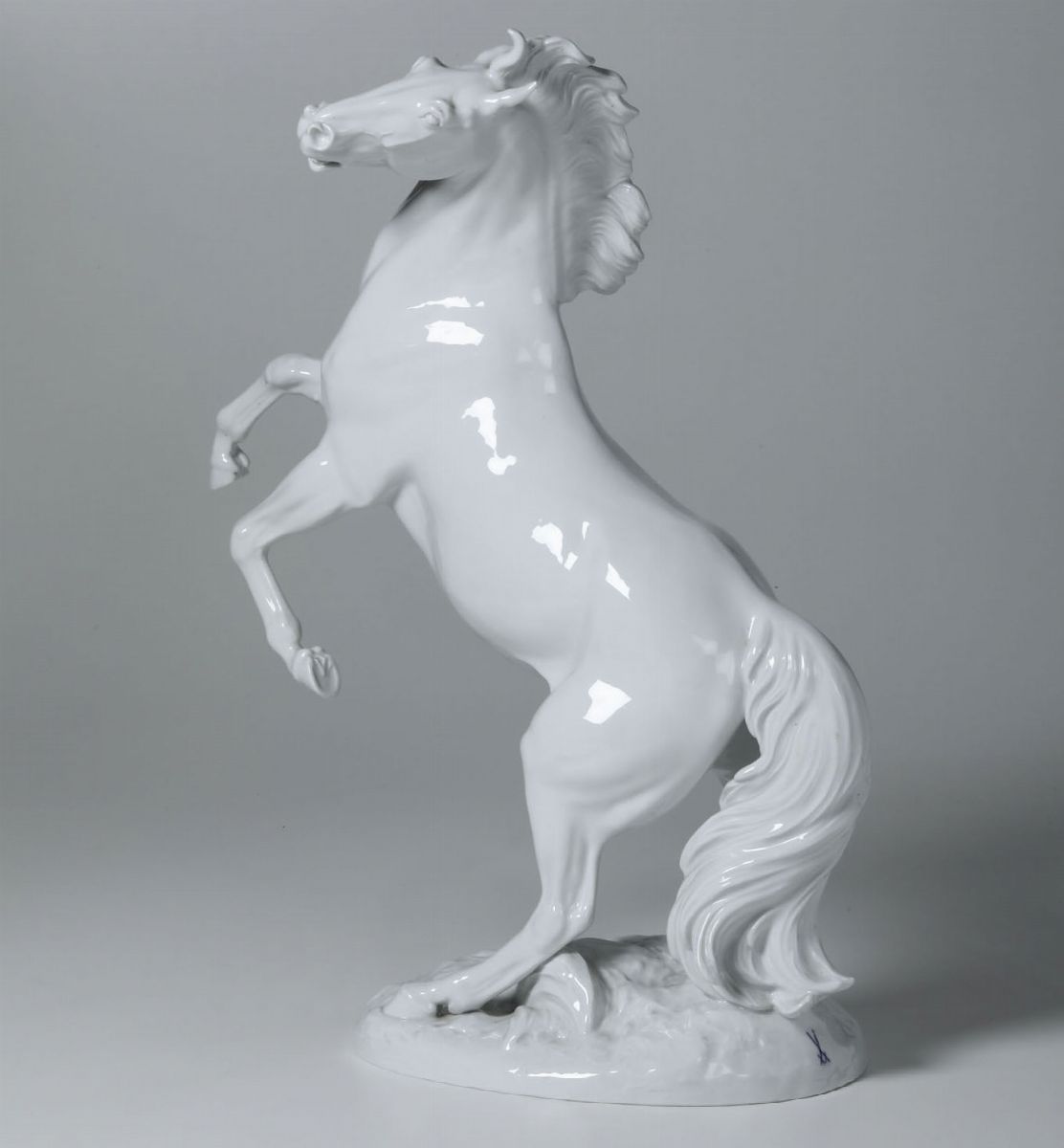 Su zolla erbosa poggia il cavallo rampante, una delle sculture di animali che l’artista Erich Oehme modellò a Meissen tra il 1935 e il 1952. Attivo presso la manifattura dal 1912 ne divenne direttore artistico dal 1936 al 1944 e fu particolarmente conosciuto per le sue espressive sculture di animali. Artista con uno spiccato interesse per l’anatomia non studia solo presso l’Accademia di Dresda ma pure anatomia al Veterinary College di Dresda