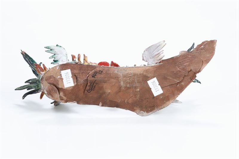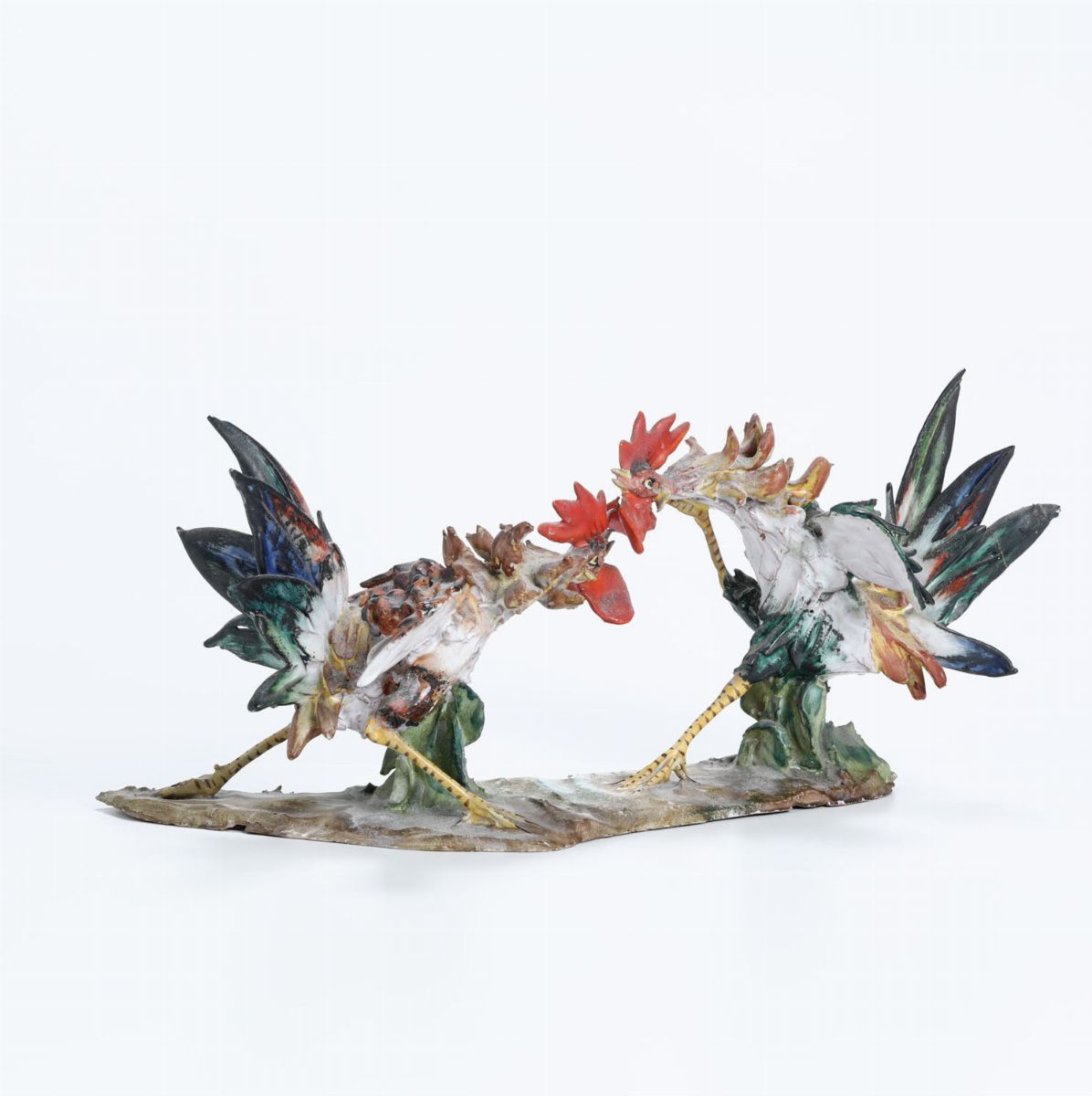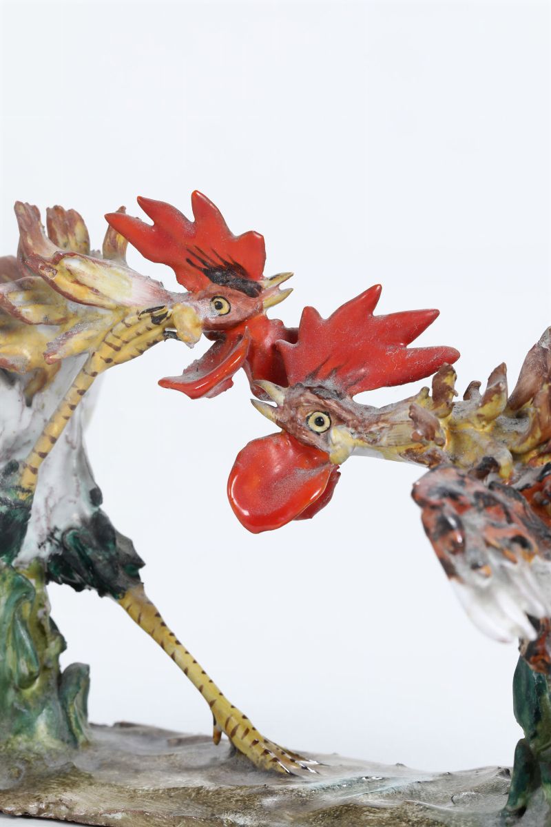 La scultura raffigura due galletti bellicosi e sono eseguiti in terracotta smaltata policroma