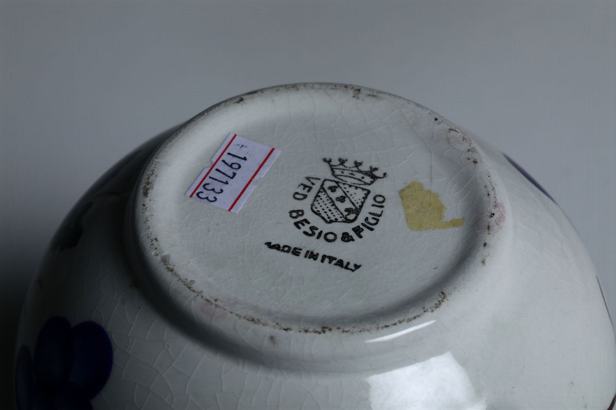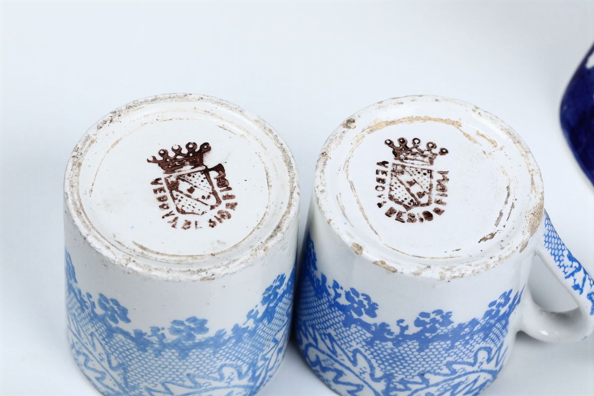 Maiolica. Marca: “Vedova Besio e Figlio” con stemma coronato. Altezza brocca cm 13,5; altezza tazze cm 6,5. Buono stato di conservazione