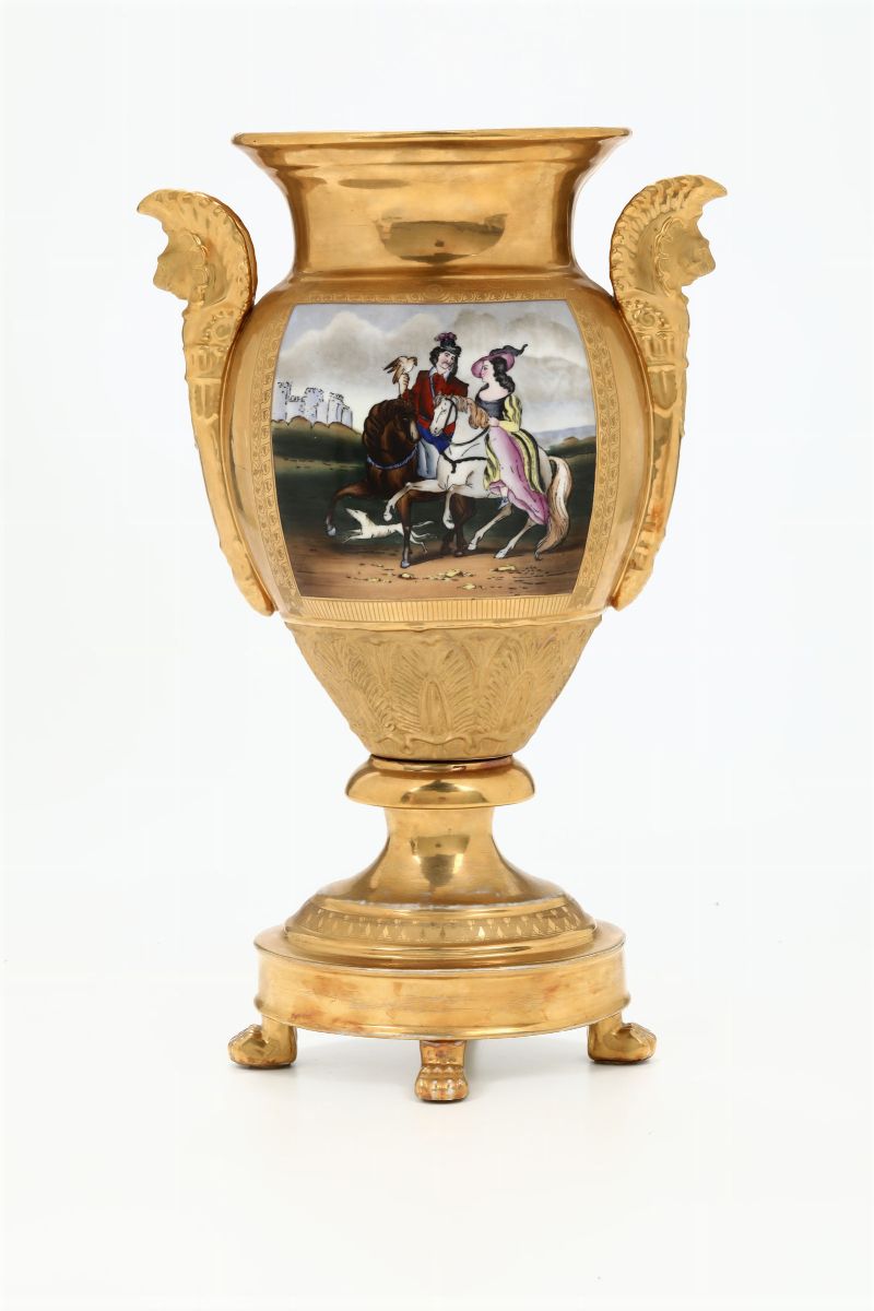 Decorazione policroma in una riserva con una dama e un falconiere a cavallo. Il resto della superficie è in oro con foglie di acanto a rilievo e motivi vegetali geometrizzati. I manici “impero” portano due teste di felino