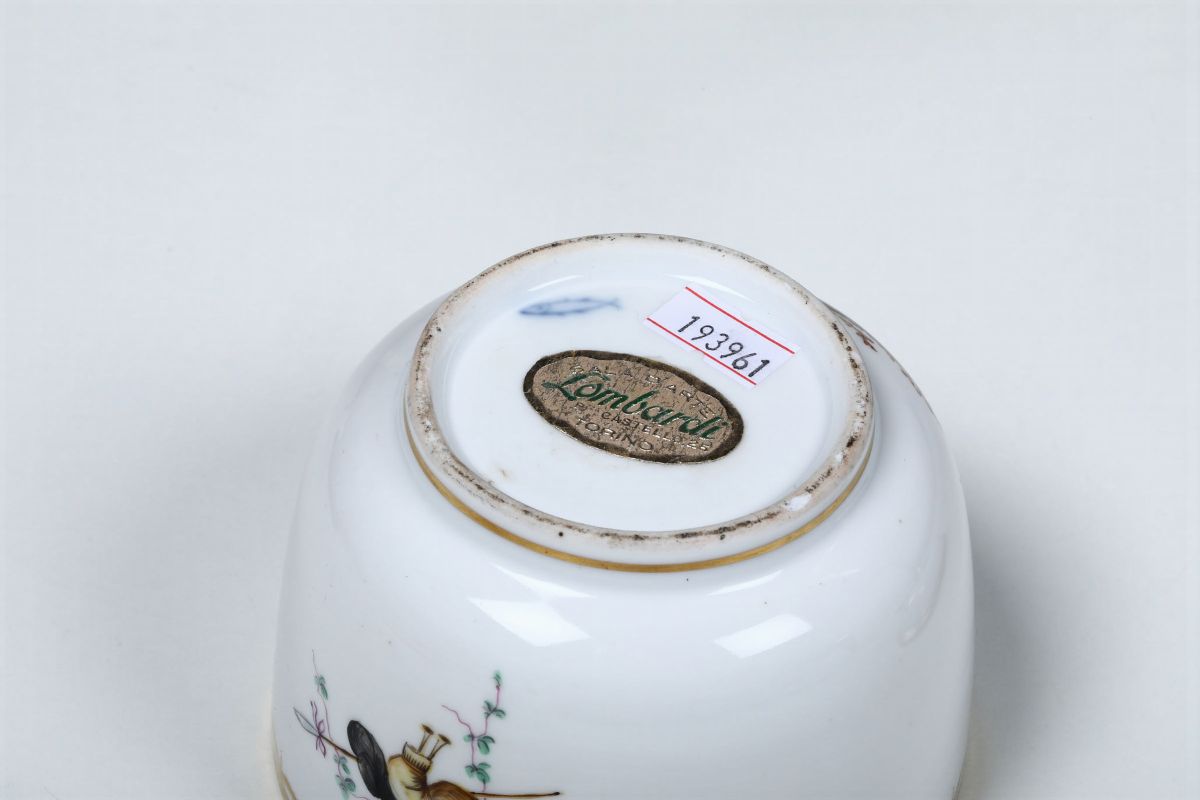 La zuccheriera è decorata in policromia a scene galanti di gusto settecentesco.