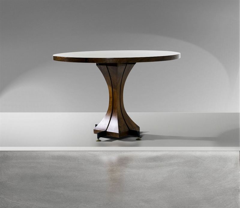 Tavolo con struttura in legno e metallo brunito. Dettagli in ottone e piano in legno.