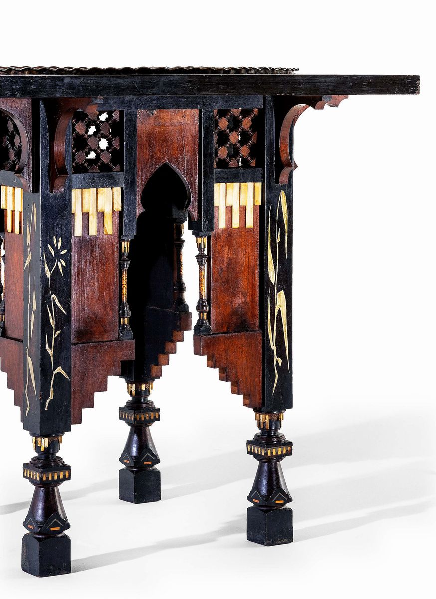 Tavolo con struttura in legno ebanizzato, rivestimenti in pergamena e dettagli in peltro, osso e passamaneria. Vassoio rimovibile in rame sbalzato.