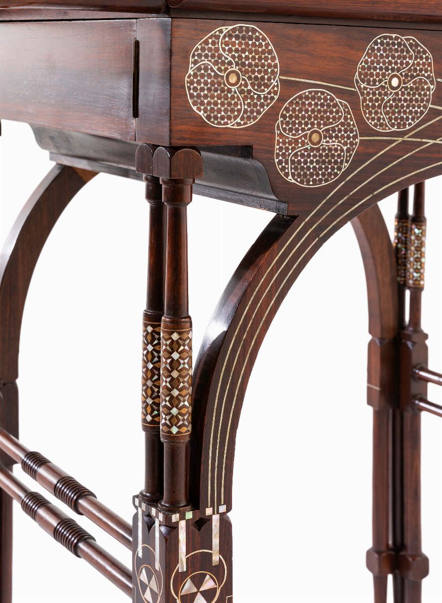 Scrittoio da signora e seduta con struttura in legno di noce. Intarsi in madreperla, ottone e argento.