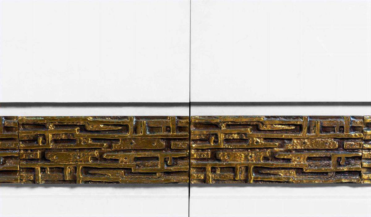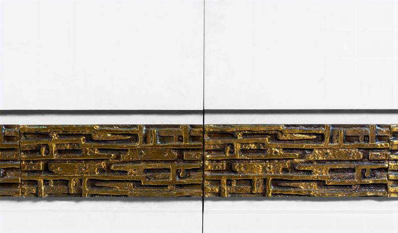 Grande credenza con struttura in legno e inserto in bronzo lavorato.