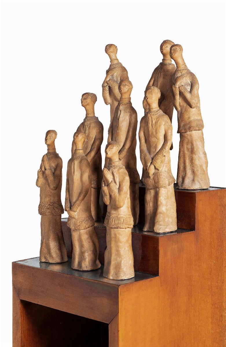 Mobile luminoso a parete con alloggiamento porta radio. Struttura in legno, piani in vetro retro illuminati. Elementi scultorei in terracotta raffiguranti un coro.
