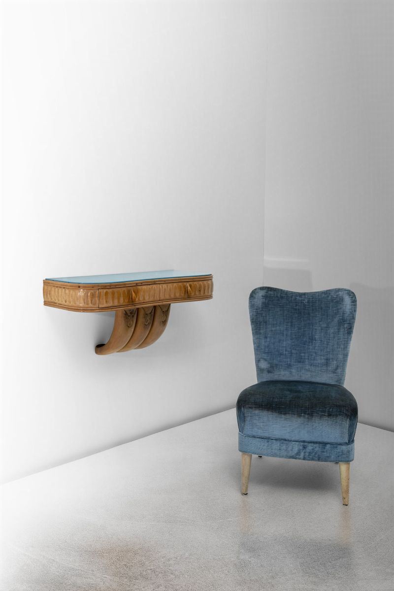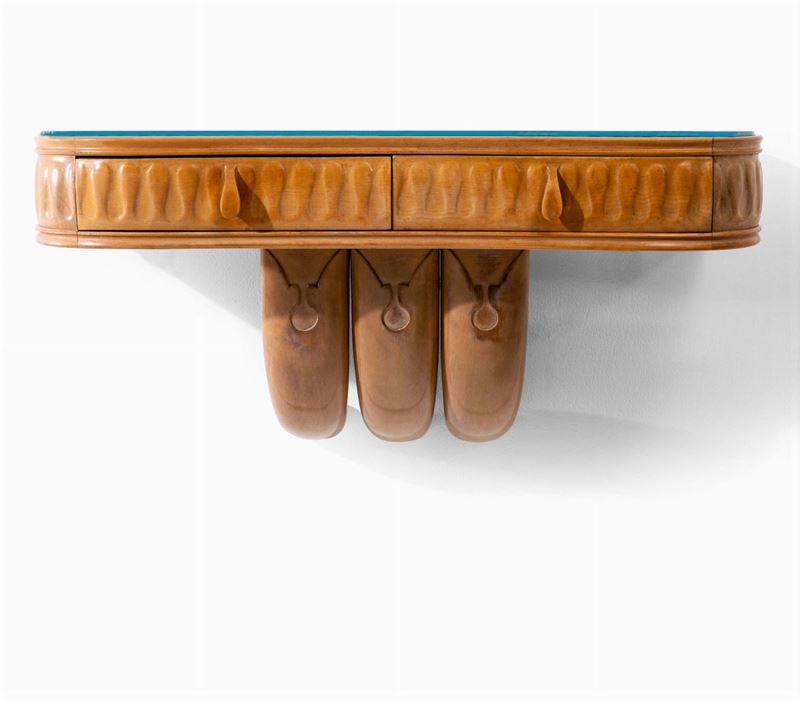 Coppia di comodini a parete con struttura in legno e sovrapiano in vetro colorato. Etichetta originale. Provenienza da una abitazione Milanese.