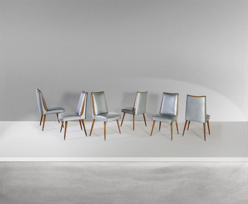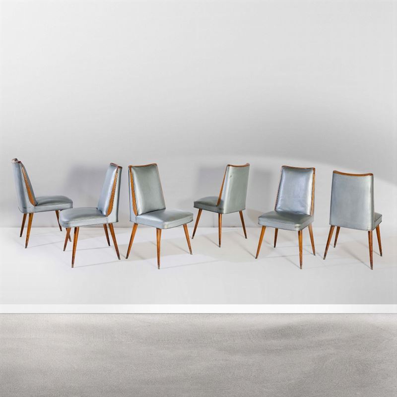 Sei sedie con struttura in legno e rivestimenti in skai.