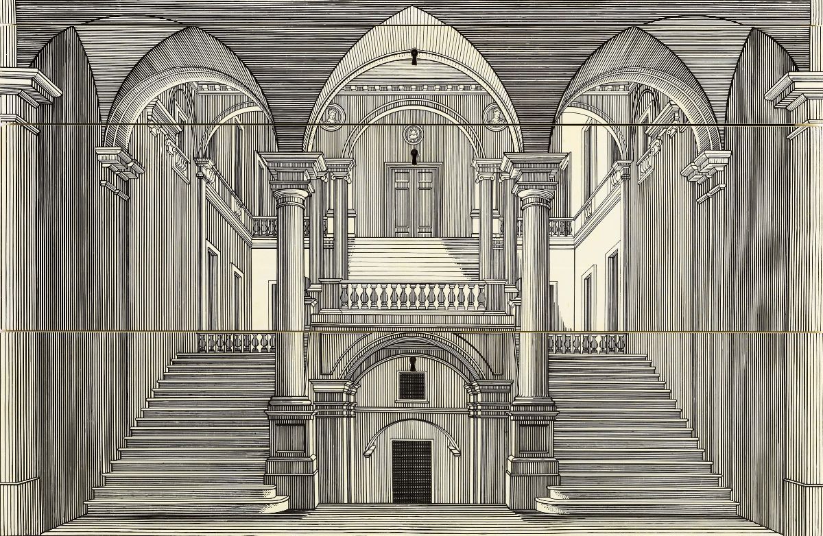 Trumeau mod. Architettura con struttura in legno e legno laccato serigrafato. Marchio originale.