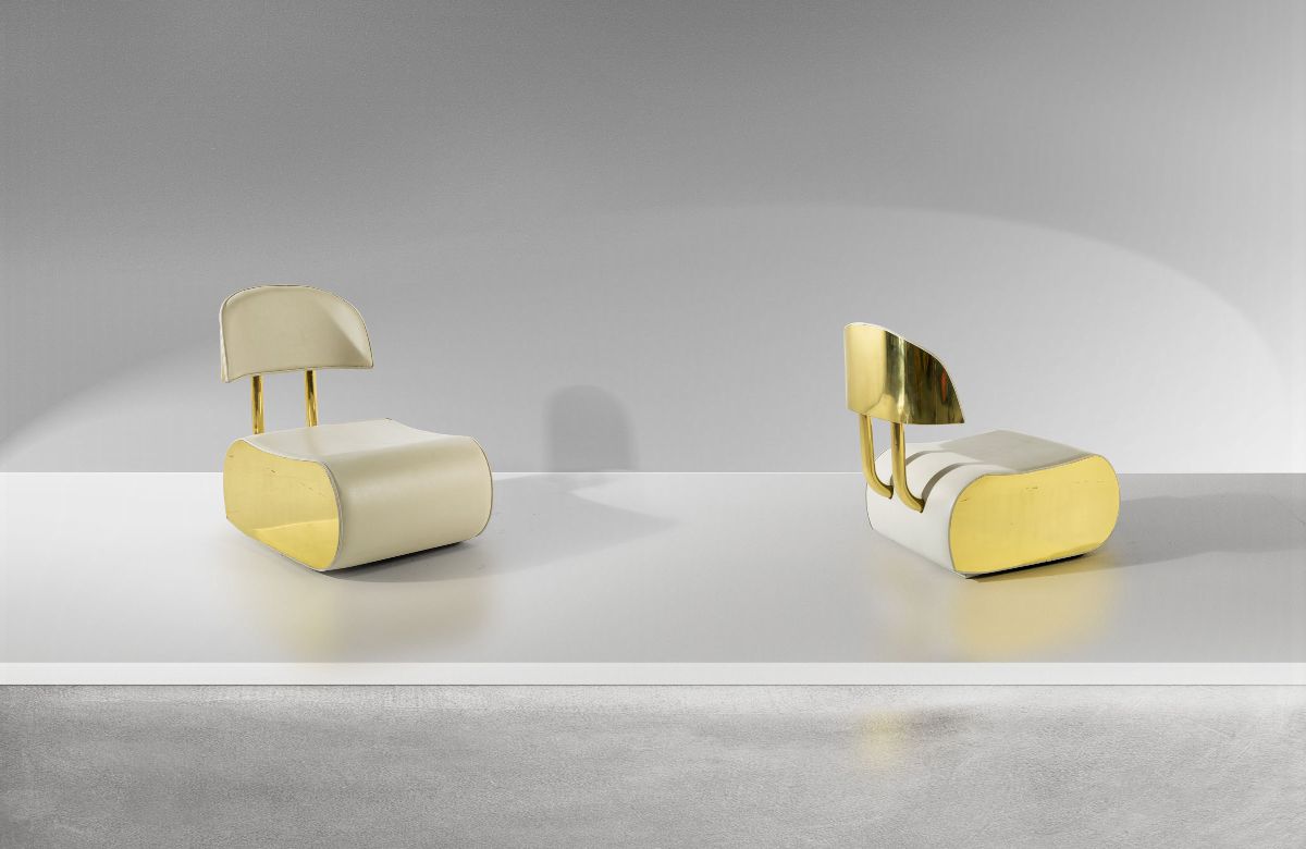 Poltrona mod. Marquesa de Santos con struttura in ottone massiccio e rivestimenti in pelle.