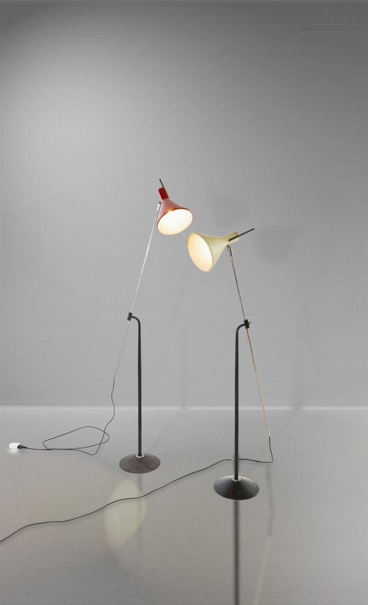 Lampada da terra con struttura estensibile in ottone e metallo laccato. Diffusore orientabile in alluminio laccato.