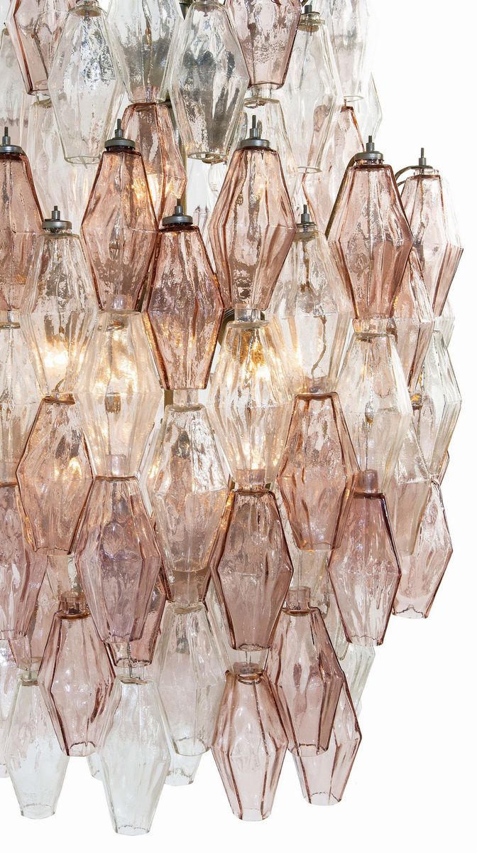 Lampada a plafoniera con struttura in metallo ed elementi in vetro di Murano della serie Poliedri.