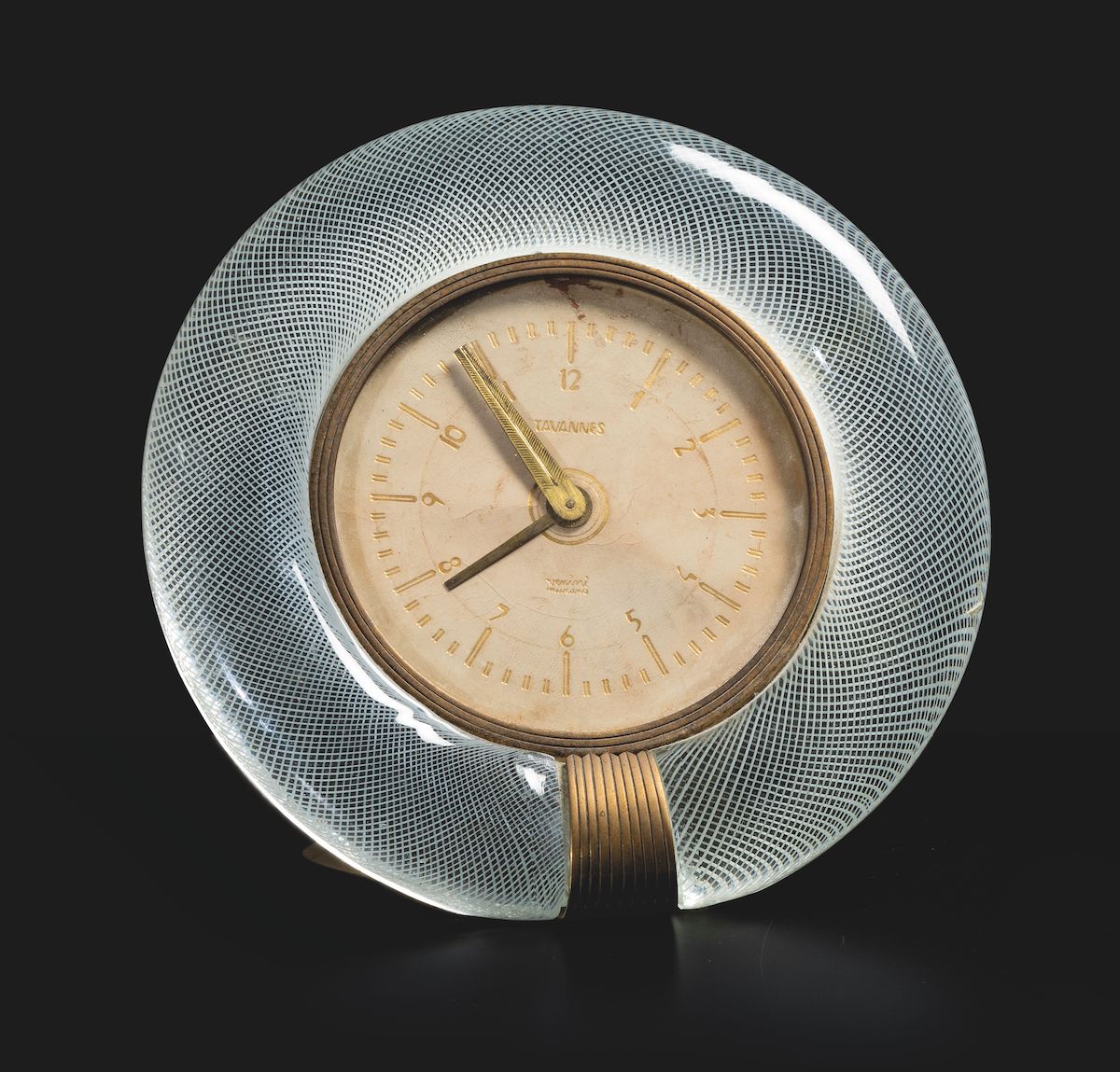 Orologio con cornice in vetro Filigrana sommersa lattimo. Montatura in ottone.