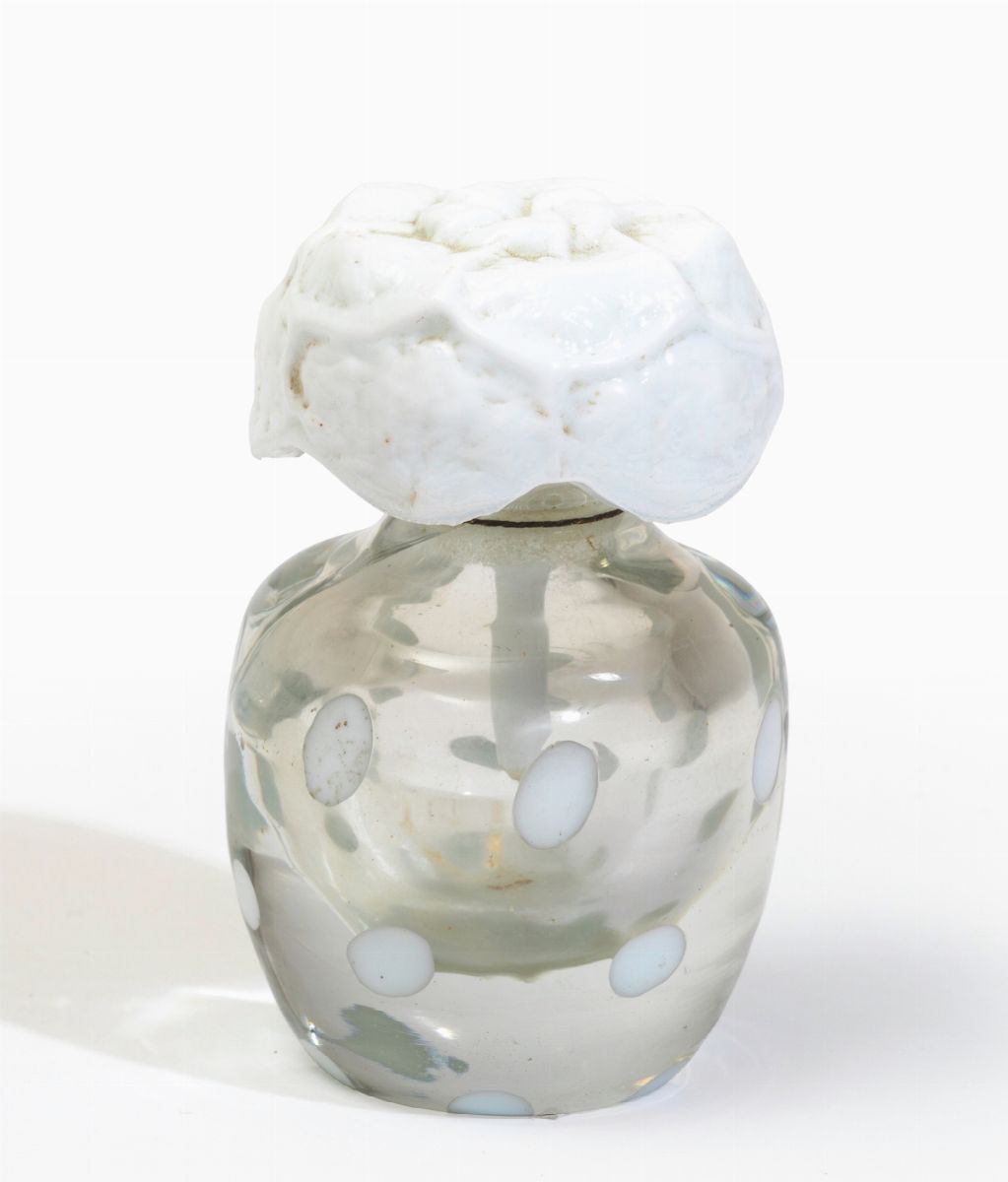 Flacone portaprofumo in vetro cristallo con decoro a puntini in vetro lattimo. Tappo in forma di gardenia in vetro lattimo
