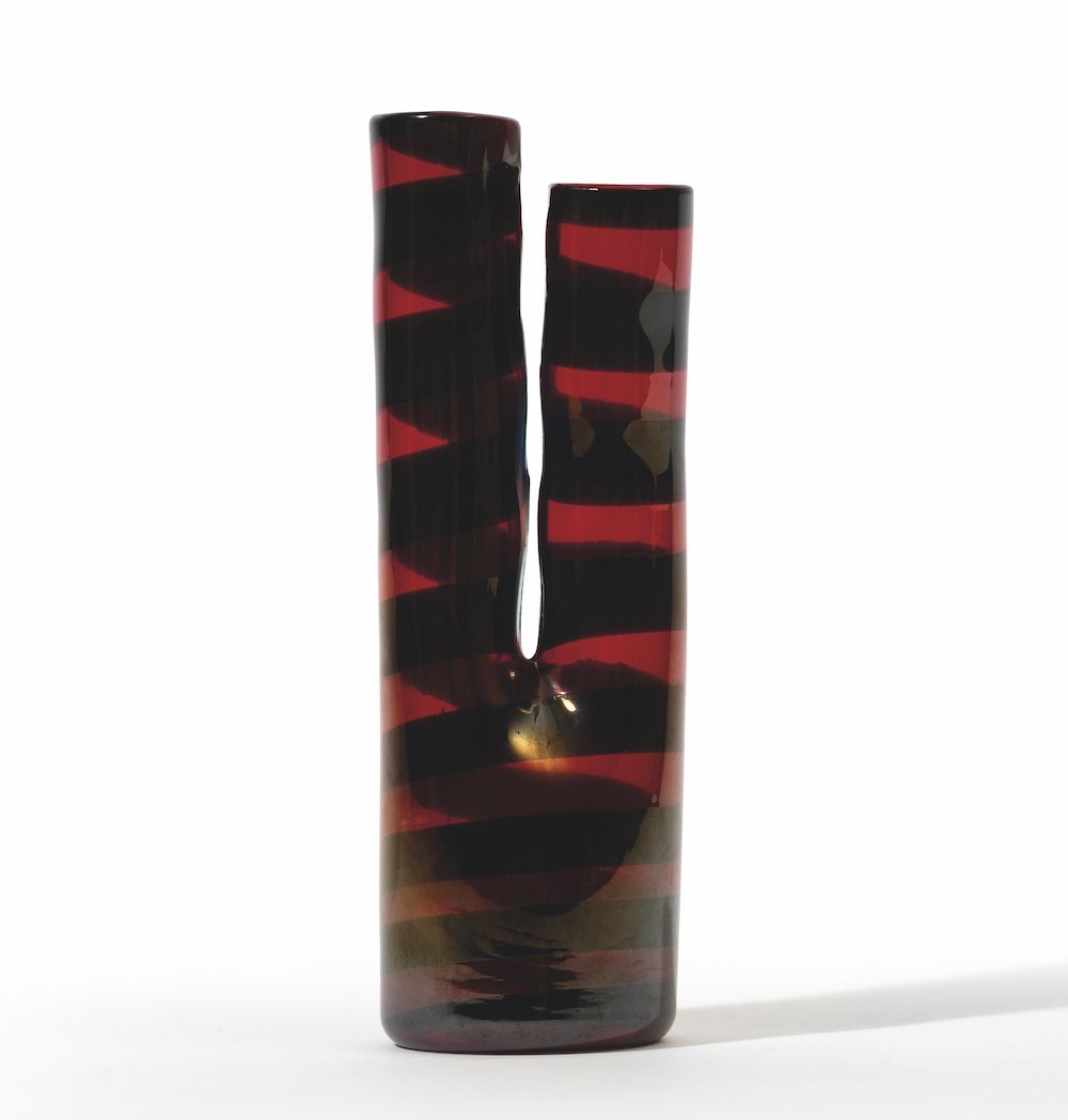 Vaso a doppia bocca serie A fasce orizzontali in vetro soffiato con decoro di fasce bicolori