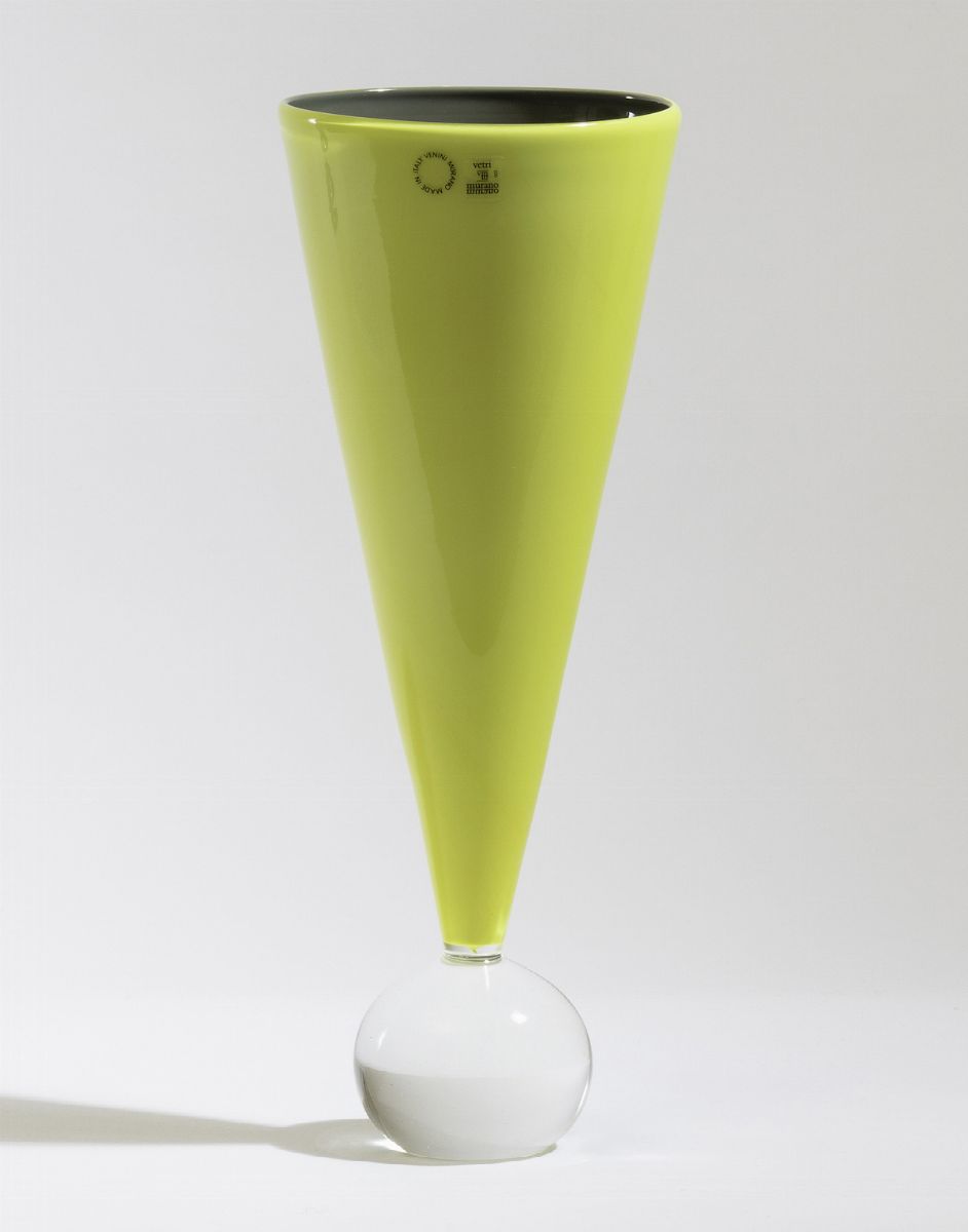 Vaso conico serie Biro in vetro incamiciato zolfo su piedistallo in cristallo sferico