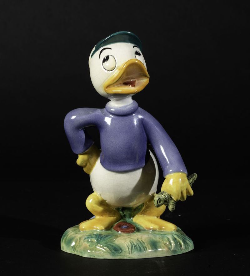 Figura di paperino Quo in ceramica a colaggio policroma