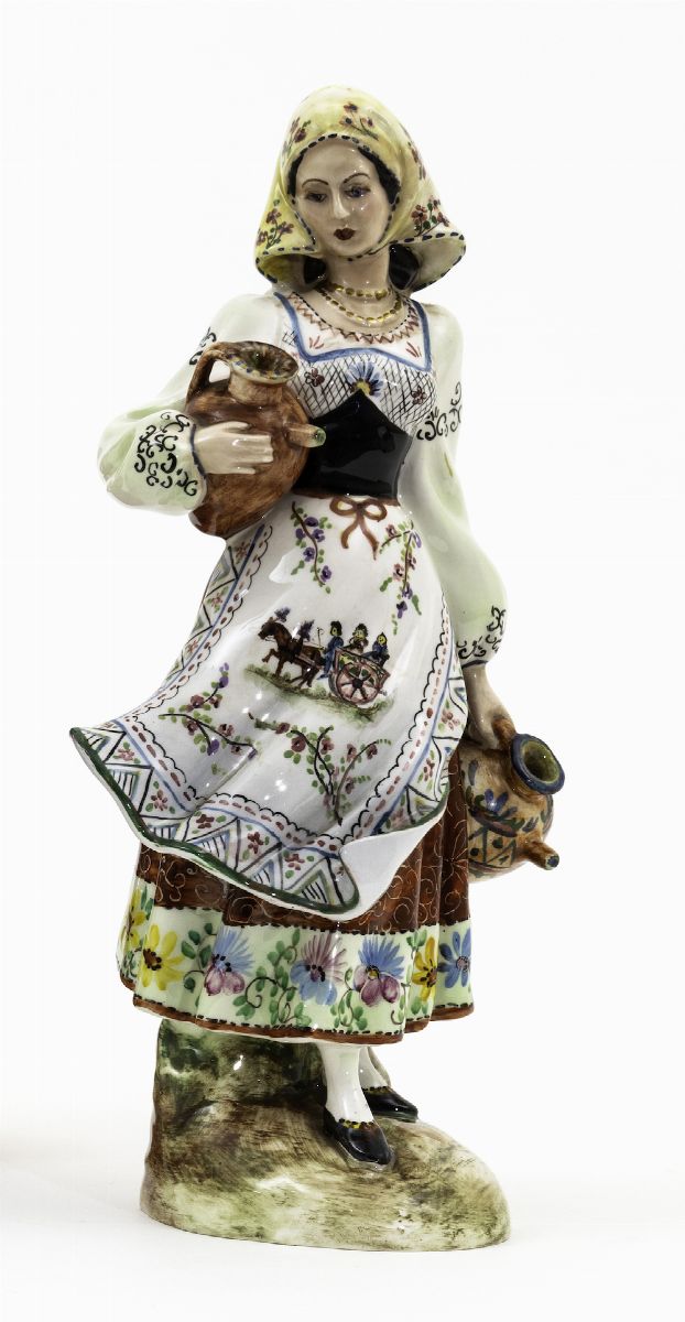 Figura femminile in tipico abito regionale in terraglia a colaggio con decori in policromia.