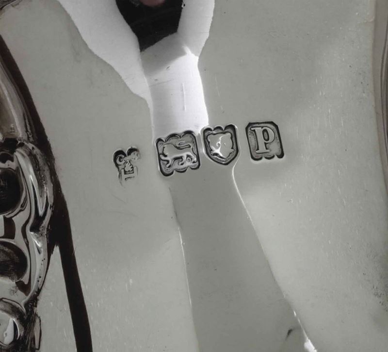 Caffettiera in argento fuso e cesellato, manico in legno. Londra 1910, marchi della città e dell'argentiere (non identificato)