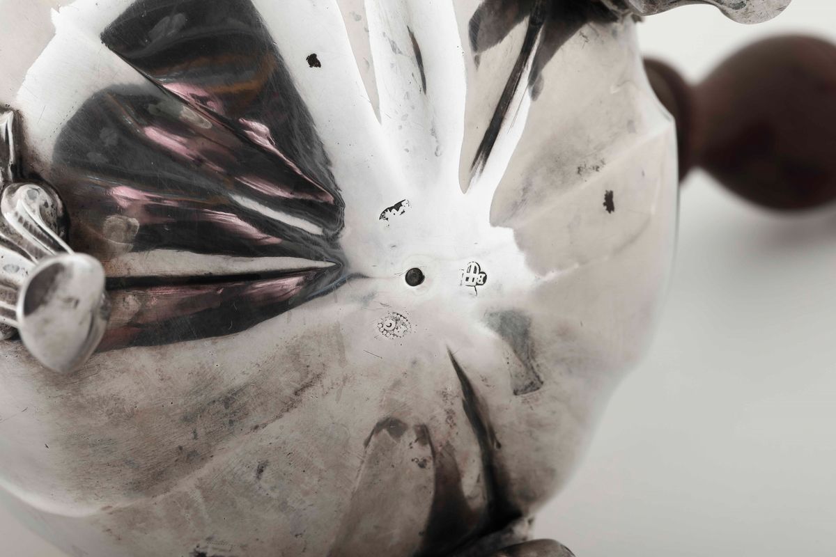 Caffettiera in argento fuso, sbalzato e cesellato; legno. Torino, XVIII secolo. Bollo di Bartolomeo Pagliani e altri due non identificati.