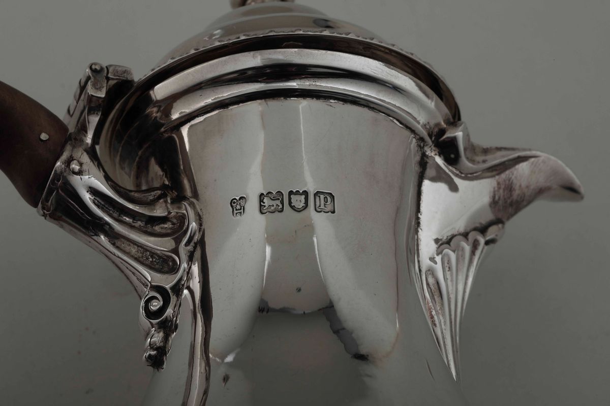 Caffettiera in argento fuso, sbalzato e cesellato. Manico in legno sagomato. Londra 1910 (marchio dell'argentiere non identificato)