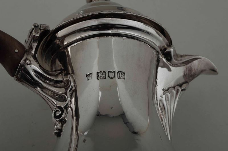 Caffettiera in argento fuso, sbalzato e cesellato. Manico in legno sagomato. Londra 1910 (marchio dell'argentiere non ide [..]