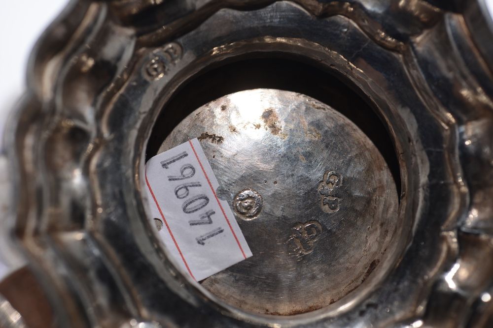 Caffettiera in argento sbalzato con manco in legno intagliato, bolli di garanzia della zecca di Venezia e del saggiatore, [..]