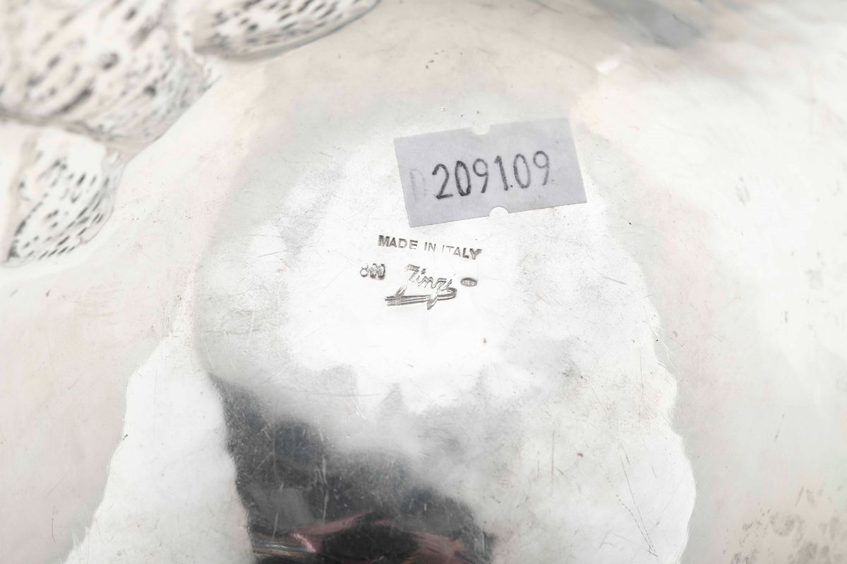 Coppetta in argento cesellato con figura stilizzata (Sant'Ambrogio?). Firmata Finzi. Milano XX secolo