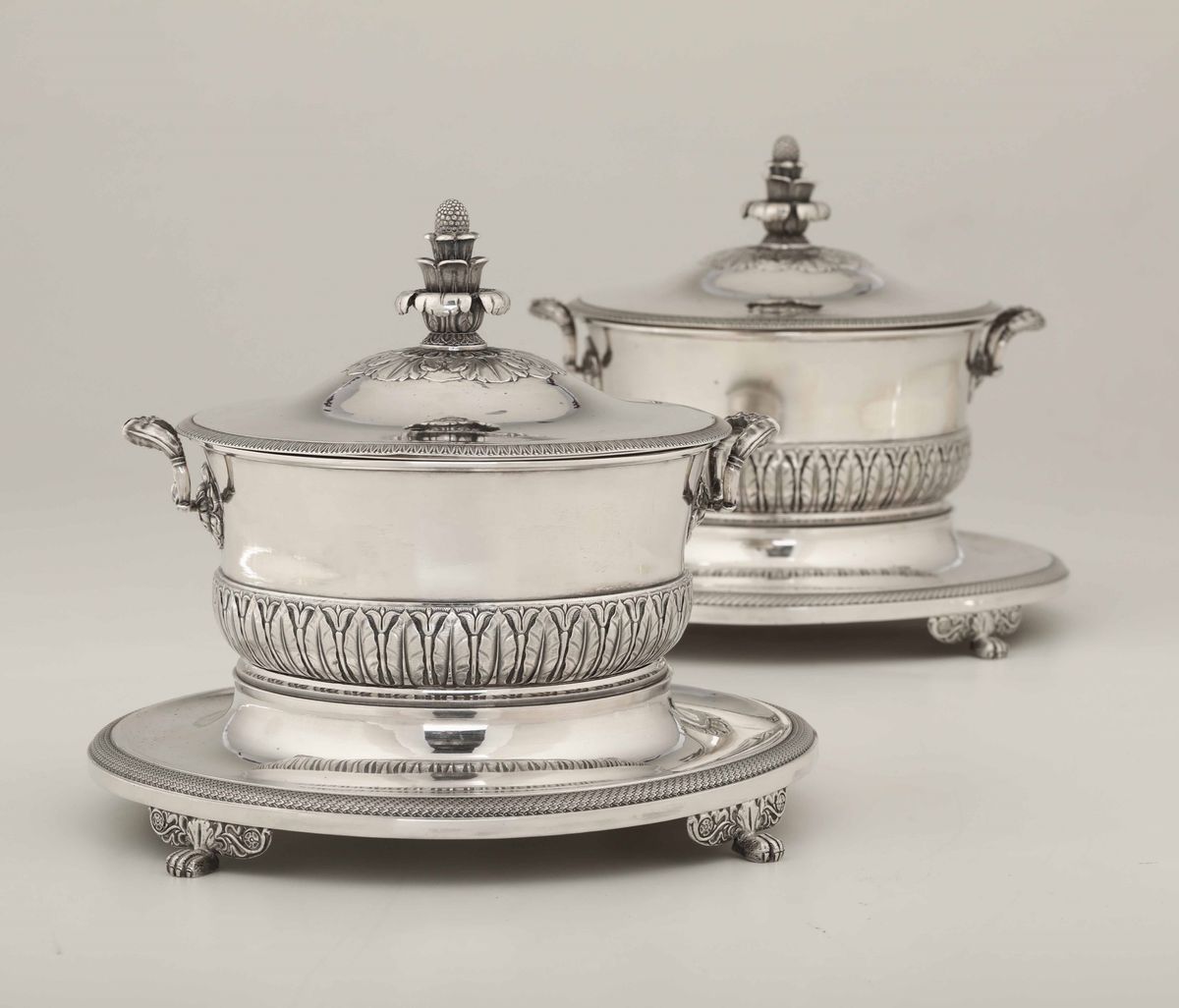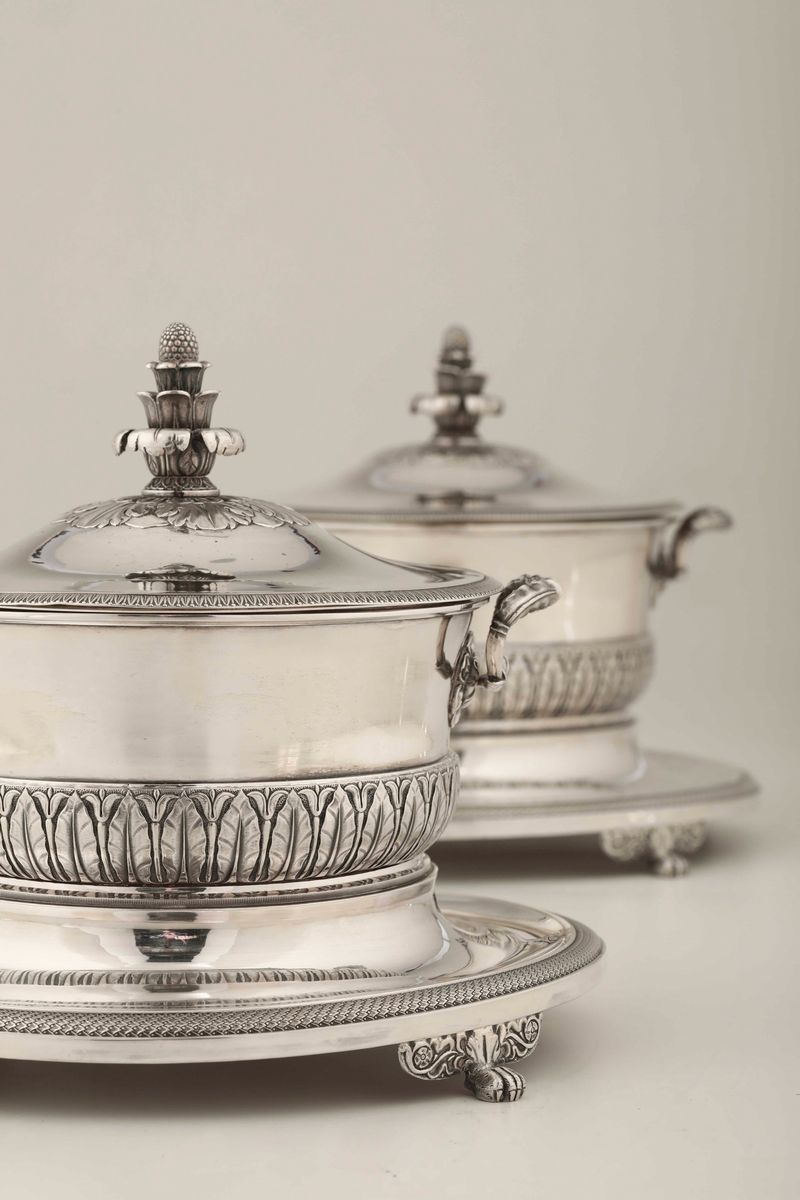 Coppia di zuppiere in argento fuso, sbalzato e cesellato. Milano 1830 ca. Argentiere Giovan Battista Sala
