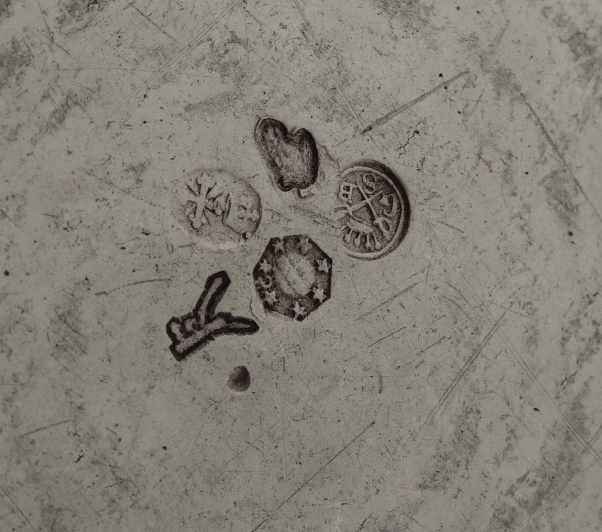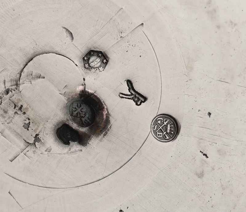 Corpo a vaso liscio con fascia sbalzata a foglie d’acanto; corte anse e presa a motivi vegetali. Piatto circolare con bordo a cordone poggiante su piedi ferini