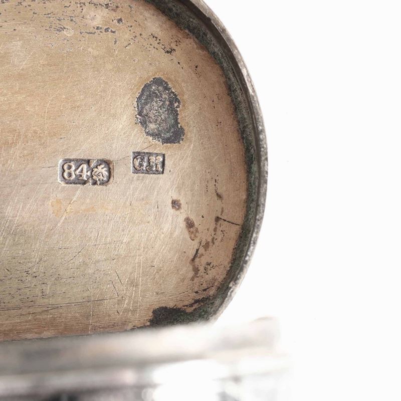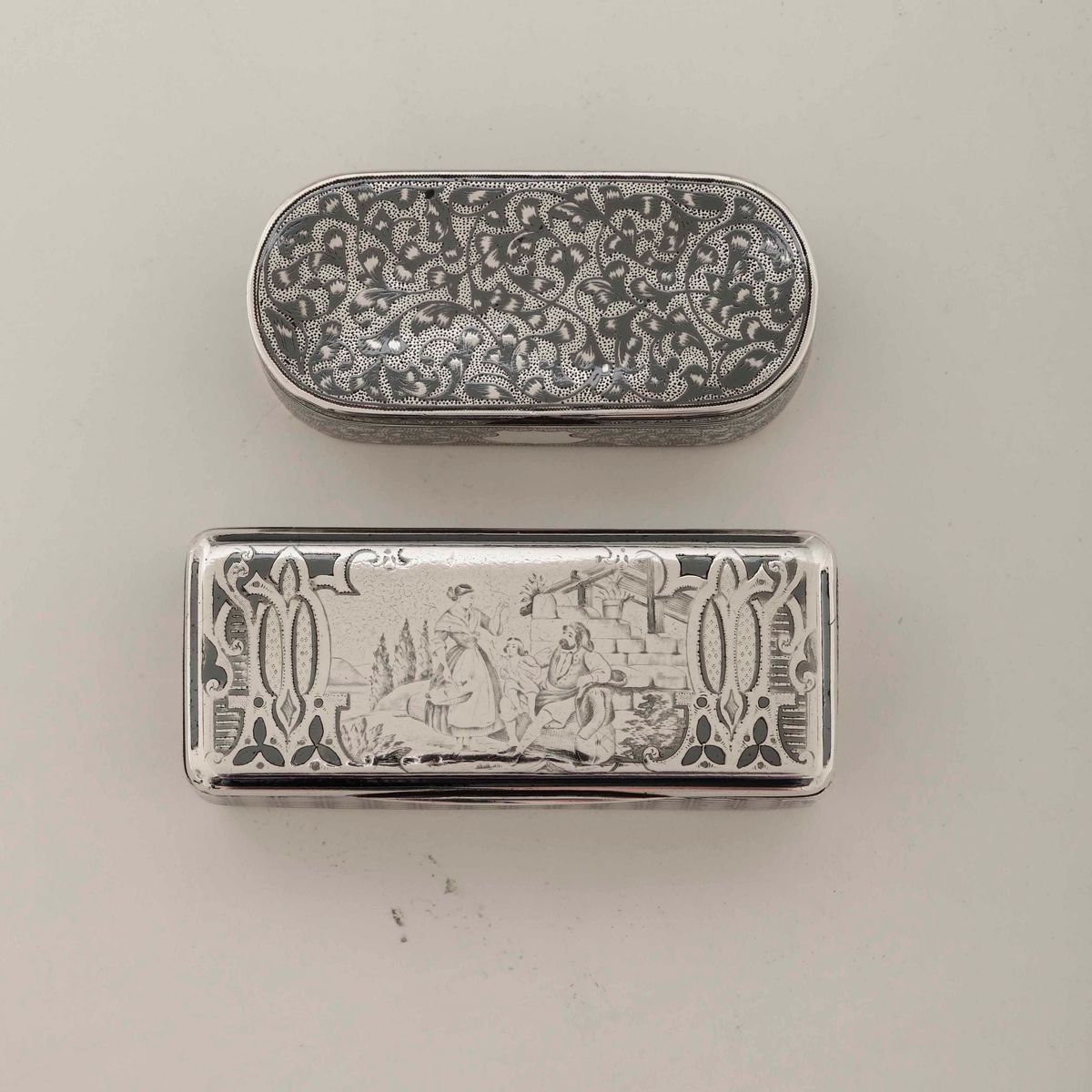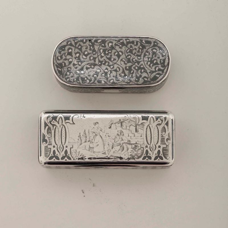 Due tabacchiere in argento sbalzato, niellato e cesellato, Russia seconda metà del XIX secolo