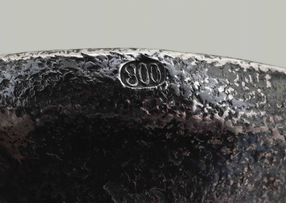 Due vasi ad anfora con sostegno a tripode in argento fuso e martellato. Argenteria artistica italiana del XX secolo. Marchio dell’argentiere Mario Poli, Milano