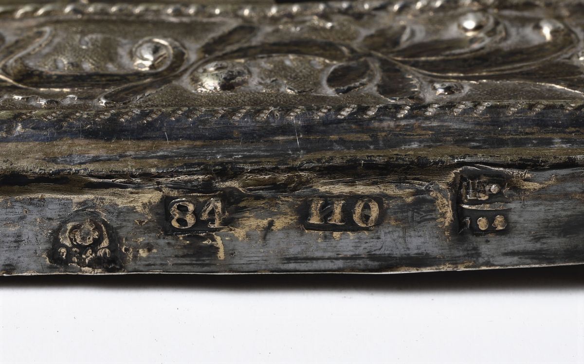 Icona raffigurante Madonna con Bambino con riza in argento sbalzato, traforato e cesellato. Russia XIX secolo. Marchi della città e del saggiatore di difficile lettura