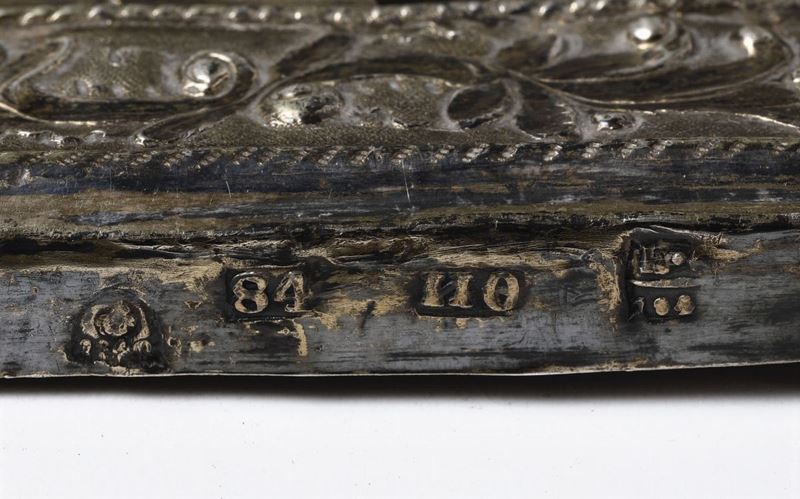 Icona raffigurante Madonna con Bambino con riza in argento sbalzato, traforato e cesellato. Russia XIX secolo. Marchi della [..]