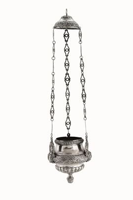 Lampada votiva in argento fuso, sbalzato e cesellato. Napoli, seconda metà del XIX secolo, bollo dell'argentiere Raffaele Sisino